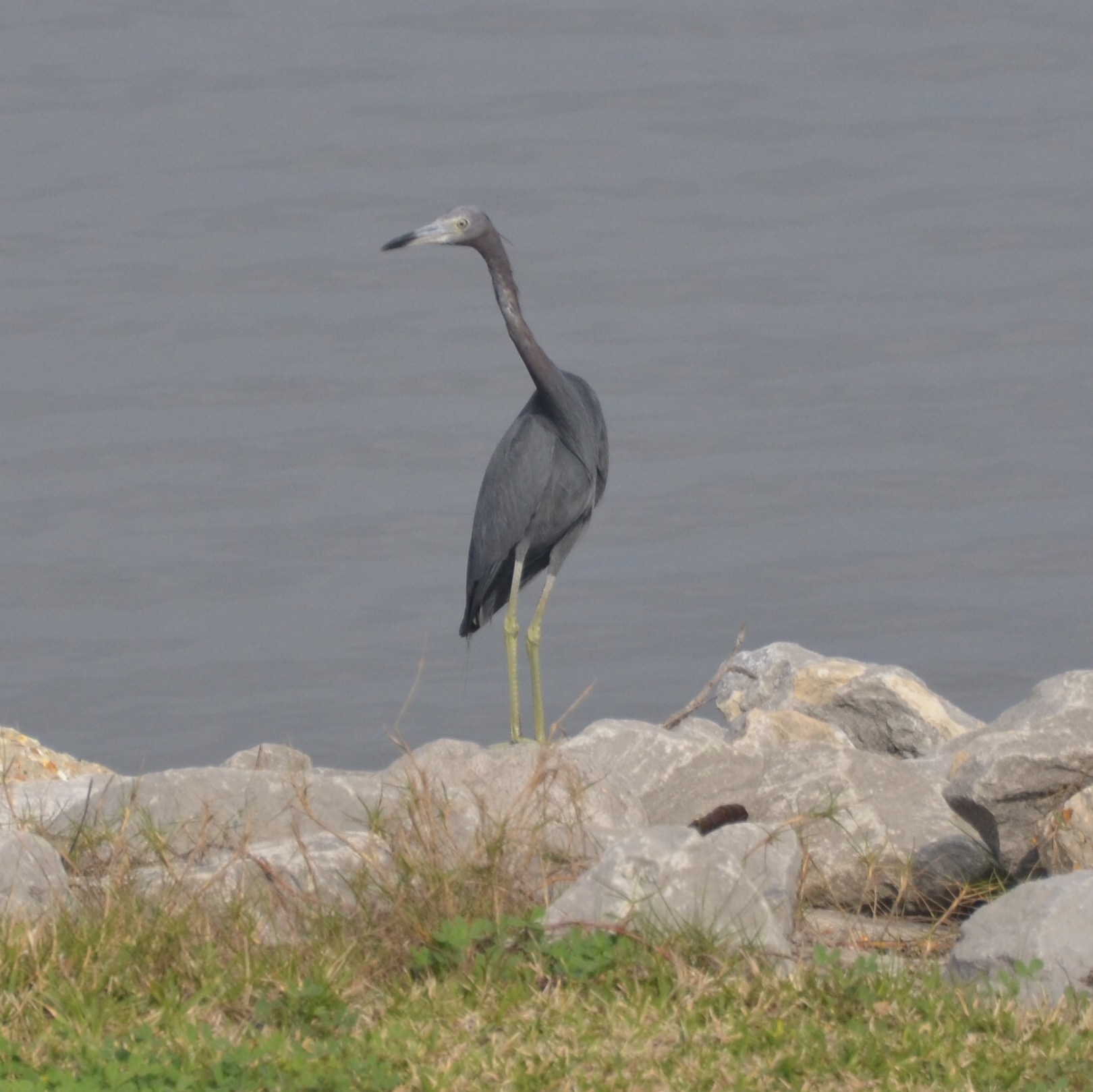 This is probably a younger Little Blue. If you look closely, you will notice it has some longer feathers behind the base of its head and some white feathers present around his head and neck. It is still transitioning from white to blue.